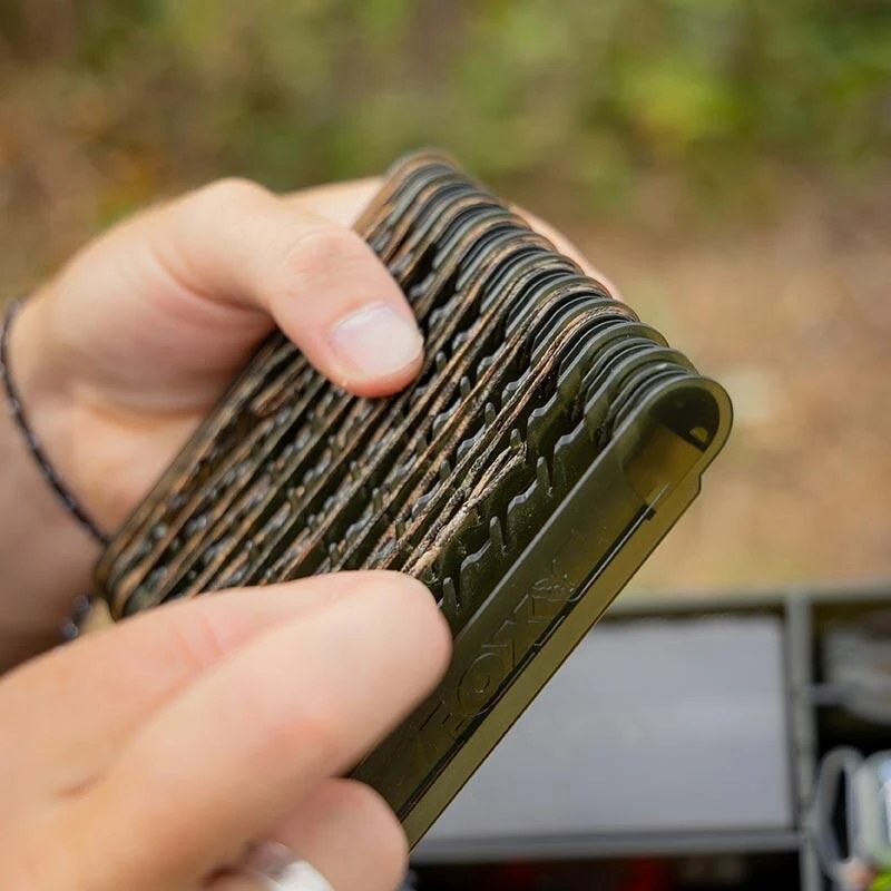 Het XL Leader Rack heeft een langer ‘cross’ gedeelte, zodat langere en potentieel dikkere voorgeknoopte leaders bewaard kunnen worden. Deze Racks bieden ruimte voor maximaal 10 lange voorgeknoopte leaders, inclusief loodsysteem componenten, zoals loodclips en helicopter beads en sleeves.