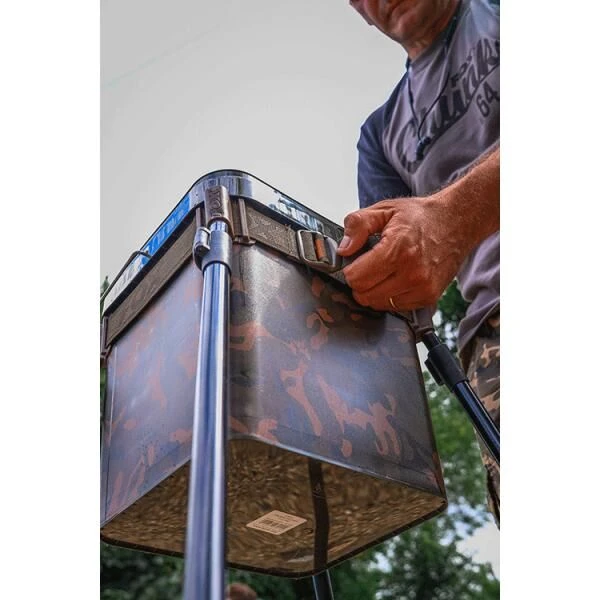 De Fox Spod Bucket Strap is een lichtgewicht en compact alternatief voor de traditionele spod stations met metalen Frame. De polyester band heeft vier gegoten bankstick bevestigingspunten. Deze Bankstick bevestigingspunten hebben RVS schroefdraad en bewegende scharnieren zodat je deze kunt gebruiken op zowel ronde als vierkante emmers. De oranje formaat markereingen zorgen steeds precies de juiste spanning voor alle maten Fox emmers ( 5L, 10L en 17L). Plaats de betreffende oranje markering in het venster van de verstelbare sluiting en schuif van onderen over de emmer tot de juiste positie. Je kunt de Fox Spod Bucket Strap met banksticks/storm poles van je eigen keuze gebruiken.