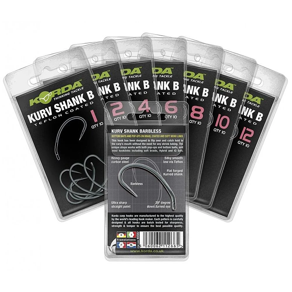 De Kurv Shank is een zeer veelzijdige haak en kan worden gebruikt met zowel pop-up- als bodemaas-rigs, waaronder populaire presentaties zoals de KD- en IQ D-rig. Hij heeft geweldige inhakingseigenschappen dankzij een agressief naar binnen gedraaid oog en een gebogen steel, waardoor het snel kan omdraaien en in de bek kan grijpen, zelfs bij gebruik zonder krimpkous of Kicker. Het haakpotentieel wordt ook bevorderd door de lange, vlijmscherpe punt. De haak is ook verkrijgbaar in een weerhaakloze uitvoering. Voor degenen die in extreme situaties vissen, vooral elders in Europa, is er een Kurv Shank XX beschikbaar. Die heeft dezelfde vorm en eigenschappen, maar een veel zwaardere draaddikte. De Kurv Shank is verkrijgbaar in de maten 2, 4, 6, 8 en 10. Alle haken worden per tien stuks geleverd.